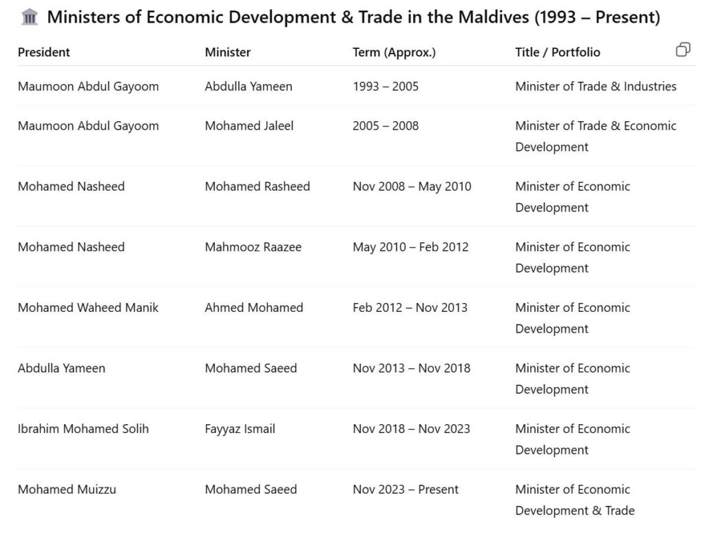 ވަކި ސަރުކާރެއް ކިޔާނެ ކަމެއް ނެތެވެ. ރައީސް މައުމޫންގެ ވެރިކަމުގައި ވިޔަފާރި ވުޒާރާ ހިންގެވުމާއި ހަވާލުވެ ހުންނެވި ޔާމީން އާއި، ރައީސް ނަޝީދުގެ ވެރިކަމުގައި ވިޔަފާރި ވުޒާރާ ހިންގެވި ރާޒީ އާއި، ޑރ.ވަހީދުގެ ވެރިކަމުގައި އެ ވުޒާރާ ހިންގެވުމަށް ހުންނެވި އަހްމަދު މުހަންމަދާއި، ޔާމީންގެ ވެރިކަމުގައި ހުންނެވި ސައީދާ އާއި ސޯލިހްގެ ވެރިކަމުގައި އެ ވުޒާރާ ހަވާލުވެ ހުންނެވި ފައްޔާޒް އާއި އަދި މުޢީޒްގެ ވެރިކަމުގައި އެ ވުޒާރާ ހަވާލުވެ ހުންނެވި ކުރިން ވެސް ޔާމީނު ކައިރިން ތަޖުރިބާ ލިބުނު ސައިދުވެސް ހިމެނޭ ހެންނެވެ.